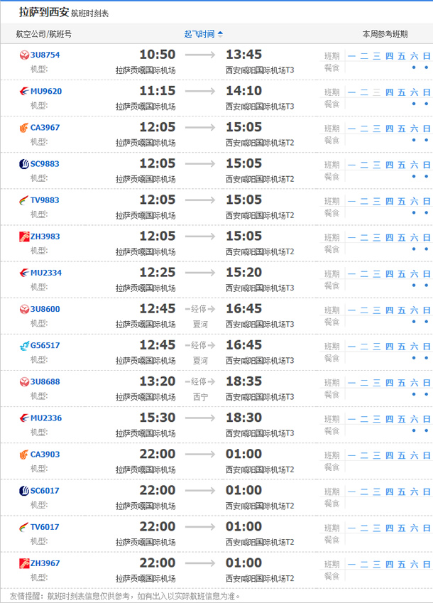以上就是拉薩飛西安的航班時刻表,起飛時間,到達時間,及固定航班日期。>>相關(guān)閱讀:西安到拉薩飛機航班時刻表