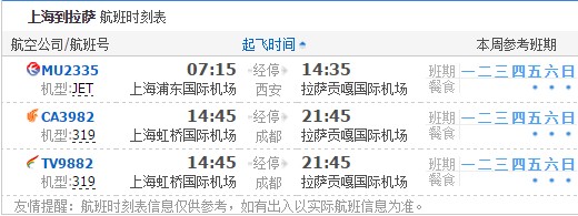 以上就是上海飛拉薩的航班時刻表,起飛時間,到達(dá)時間,及固定航班日期。
