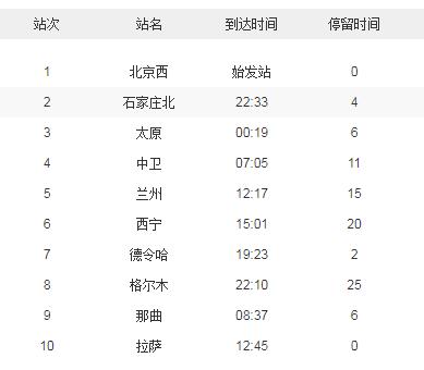查詢2019年11月1日北京到拉薩的列車有Z21次,全程40小時30分鐘,20:00從北京西出發(fā),12點45到達拉薩,途徑石家莊,太原,蘭州等省會城市。具體詳細行程請參考北京到拉薩的火車時刻表。